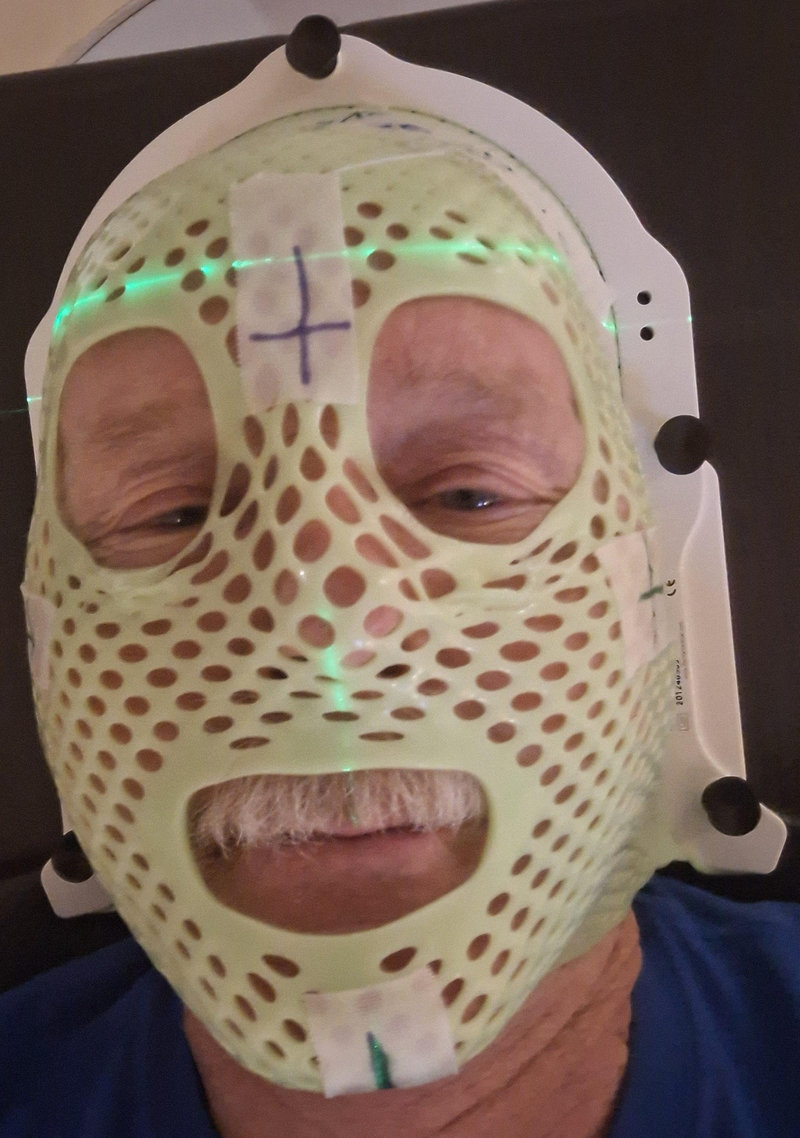 Once I was on the table with my head secured, the radiation Techs would exit the room & close the vault door. The beam arm would move close to my face, I’d feel the table move slightly a few times, then the arm would quietly begin rotating slowly around my head. Not for the claustrophobic.