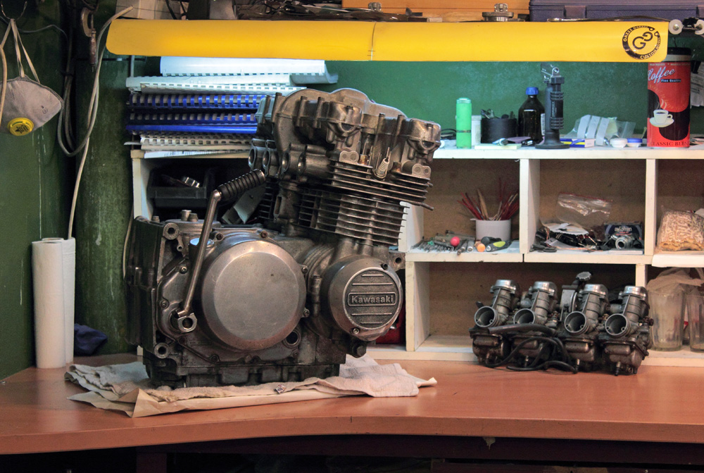 Thus I decided to start KZ650 cafe-racer project from scratch, however I already had the engine. I bought it by sheer occasion in 2011. In that days I had no such broad access to ebay and international shops so I kept my eye on local internet boards for "rare" parts and sure, I couldn't pass by that engine: complete with carburettors and wiring. I bought it and drought it to my former garage, where I partly disassembled it to check its condition, oiled what needed to be oiled and put all parts in marked boxes to avoid loss of even smallest parts.