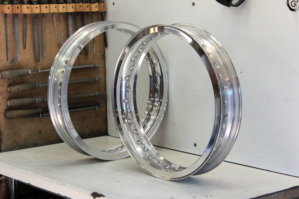 For conversion I initially chose replica of Borrani Record rims (made in Italy), also called high shoulder or H-type rims. I chose 18″ 2.50″ wide rim for front wheel and 18″ 3.00″ rim – for rear.
