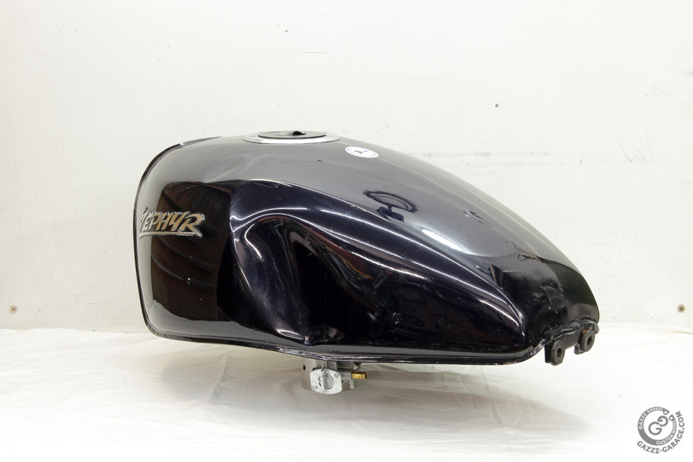 Well, it turned out that time is more pressing than I thought. So instead of putting another couple of posts about the project I am forced to jump right to its latest page. At some point I and Oksana decided to go further with the Zephyr 550/400 project and make modified Zephyr as we see it. However, I couldn't repaint the tank and side covers of the Zephyr 400 that stands in my workshop since it's not mine. So I bought a spare tank for this purpose. Photos on ebay-kleinanzeigen showed that it had some dents, but the price was fair and the seller was easy to reach by email, so I wrote to him and bought the tank with direct delivery to Ukraine. When the tank arrived I found out that photos taken at right angles under right light may hide a lot. In my case it was a large dent that I didn't recognize in photos. It wasn't the mother of all dents, but close to it.