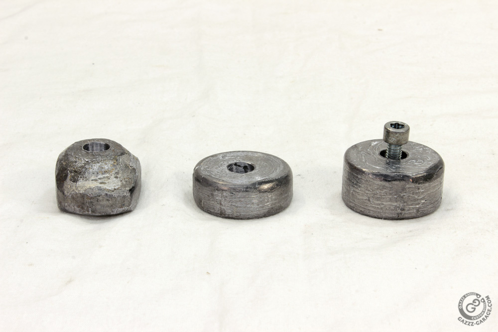 So I decided that this tank is a good reason to work out methods to remove dent from inside without scratching the tank from inside. I tried a couple of ideas, but they failed. Then I found a solution. It was simple: lead for "hammer" and copper for its handle. Lead is easy to melt and shape and it is heavy. Copper pipe is easy to bend so one could reach in all corners of tank insides. Both copper and lead are softer than steel. If it would be possible with a tank of such a complicated configuration like this (wide tunnel, tight corners and an overflow pipe that goes diagonally from fuel cap neck to right rear corner of the tank) it would be possible with most other tanks. So I gradually work out configuration of hummers, from round billets to cylindrical ones. I cut a thread in a copper pipe and fixed round heads with bolts. In cylindrical heads I drilled holes, cut the thread and screwed threaded rods (studs) into them. Cylindrical attachments are more universal: both butts and sides may be used for hammering.