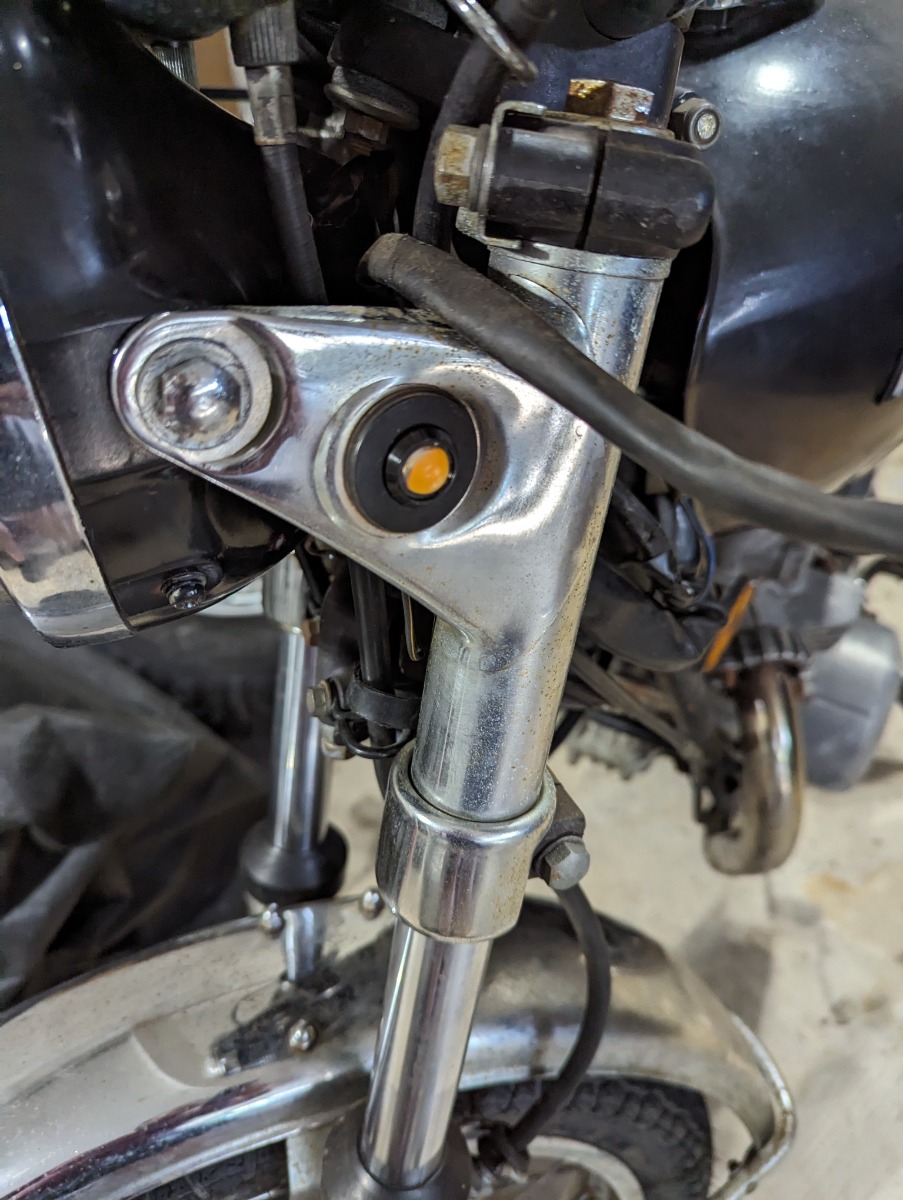 Headlight will be here later this week but finally got the blinkers replaced, lot more work than it should have been mainly because the LEDs had super thin wiring, but that's more my fault, should have known based on how cheap they were. Had to make a ground for them but was able to reuse some of the original hardware and didn't have to cut anything but the power wire really so it could be swapped back if needed.