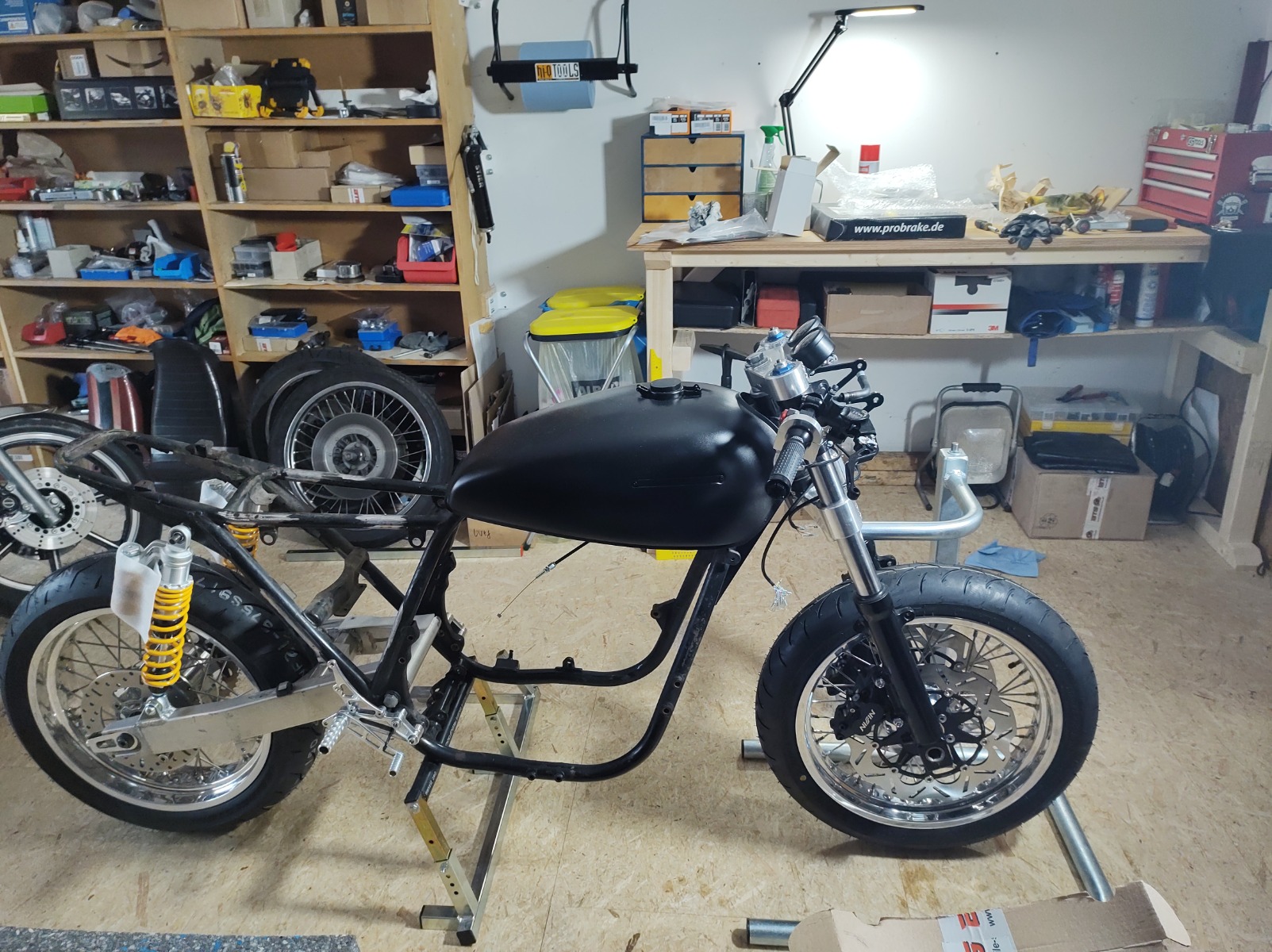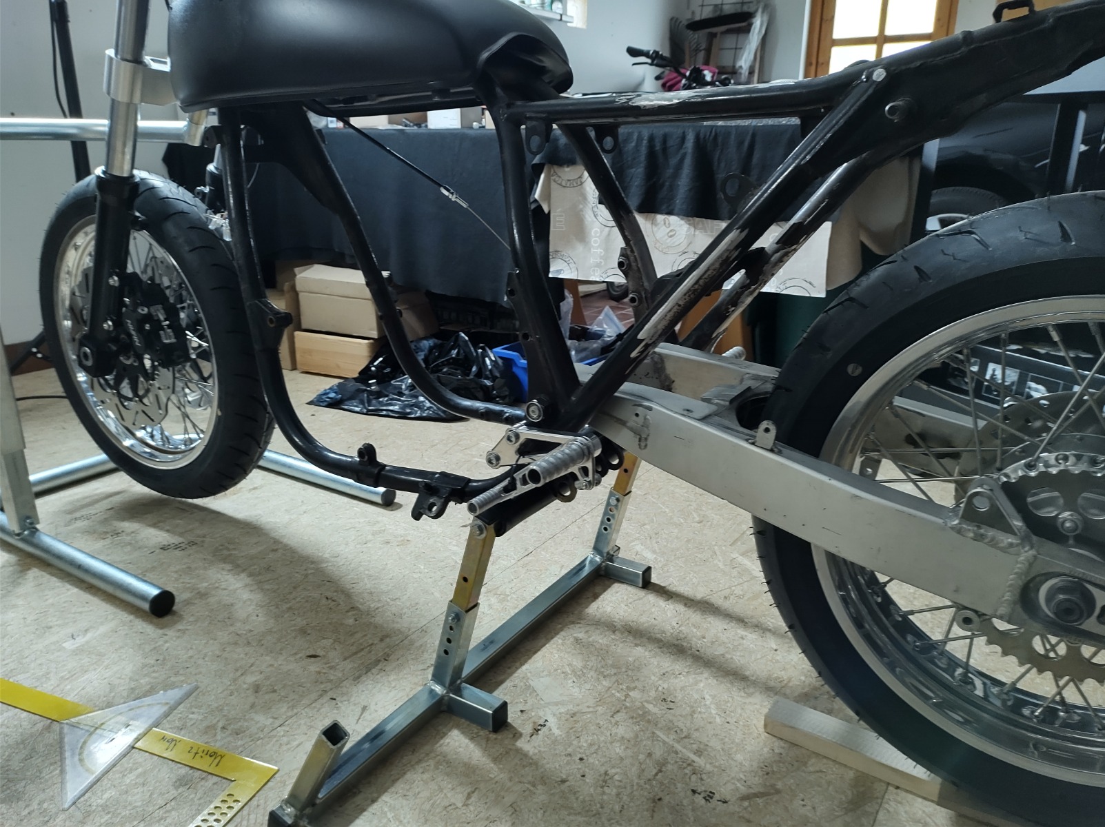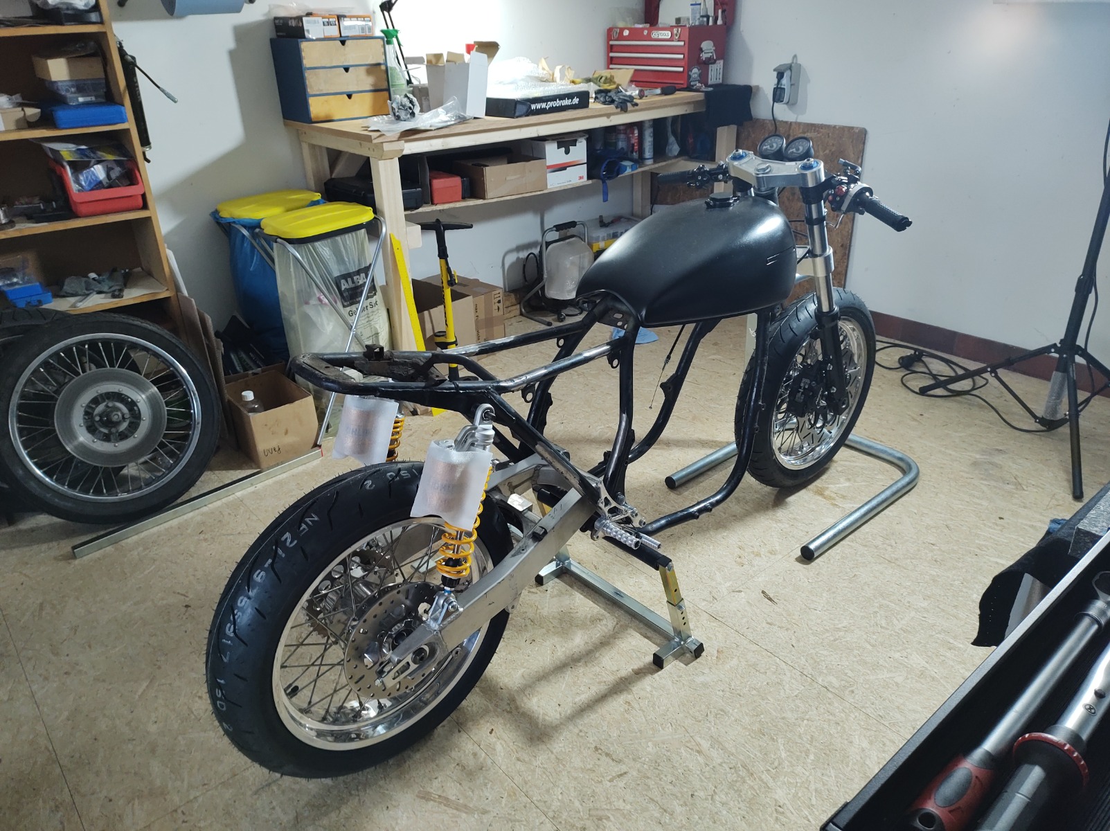 Had a bit of time today and got the wheels on. Checked rake and trail and without changing anything I'm at 22°and 94mm. I crunched the numbers and if I can raise the back by 7-8mm I'll end up with 25° and about 107mm trail. Slightly more trail than the ZRX but I have 10mm of adjustment in the shocks. At the moment I can go about 3mm shorter and 7mm longer so I'll probably centre them and lift the back wheel by about 7mm. Then I should have a decent range of adjustment in both directions. I haven't checked the swingarm angle yet (a job for tomorrow) but it looks a bit steep so lifting it up a bit should be fine.