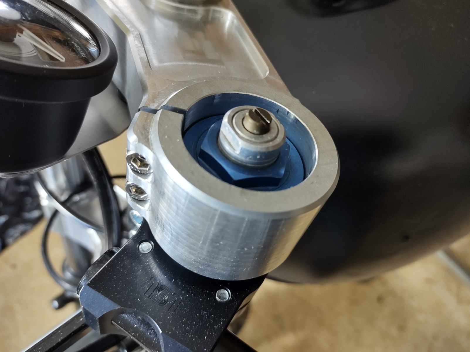 The top yoke was drilled to take the risers, all the spacers and engine bolts/brackets have been made.. the bolts being made from 316 stainless. I spent far too much on a pair of remote reservoir shocks by K-Tech. They are built to the spec of a ZRX1200 (365mm) but with slightly softer springs, as the bike should be lighter than a standard ZRX, while its unlikely it'll ever carry a pillion.